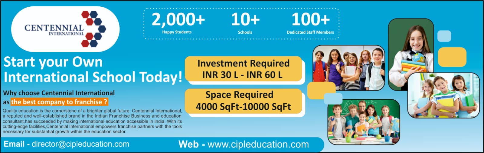 At Centennial International Private Limited (CIPL), we are creating business opportunities that empower school communities with extraordinary educational opportunities. Our Franchise business extends beyond merely establishing a school; it involves establishing a vast network of forward-thinking and innovative schools aimed at catalyzing holistic development and lifelong learning. We intend to nurture knowledgeable and compassionate future leaders who can achieve personal success while driving positive changes. We aim to develop responsible citizens who lead our nation forward by contributing significantly to its advancement and prosperity.